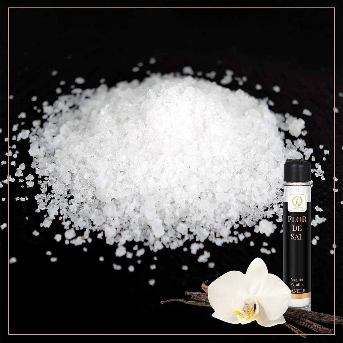 FLOR DE SAL: Verfeinere Deine Gerichte mit dem feinen Meersalz mit Vanille-Aroma, das behutsam und von Hand in zarten Flocken aus dem Meer an der spanischen Küste abgeschöpft wird.