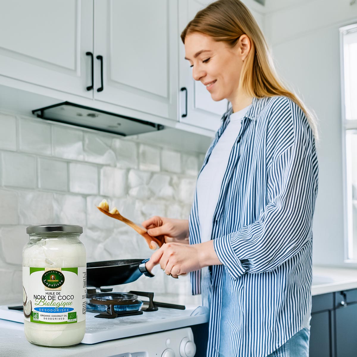 - Gesundes Kochen: Kokosnussöl ist hitzestabil und behält auch bei hohen Temperaturen seine gesunden Eigenschaften bei.