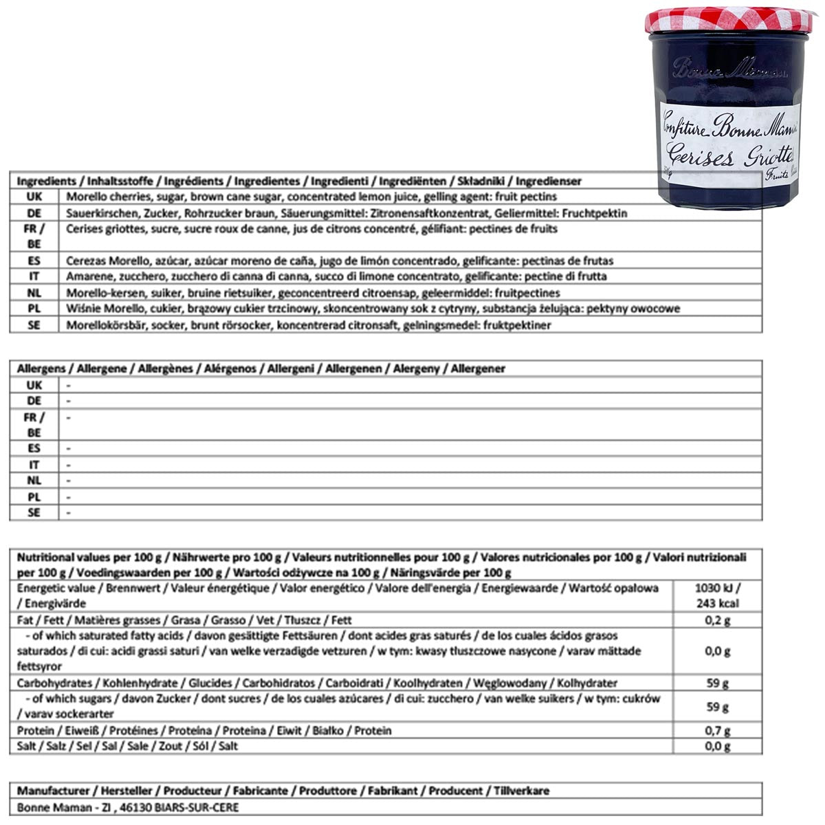 Bonne Maman legt größten Wert auf die Qualität der Zutaten. Die Sauerkirschen werden in Frankreich sorgfältig geerntet und zu einer Konfitüre verarbeitet, die den reinen und intensiven Geschmack der Früchte bewahrt. Diese erstklassige Qualität garantiert Ihnen ein Produkt, das höchsten Ansprüchen gerecht wird.