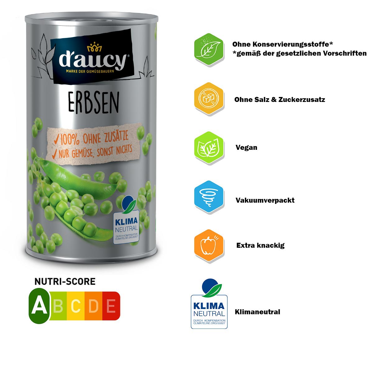 - Einfach genießen: Die Dosen von d'aucy enthalten kaum Sud, d.h. die Erbsen müssen nicht mehr abgetropft werden. Zudem sind sie direkt verzehrfertig.