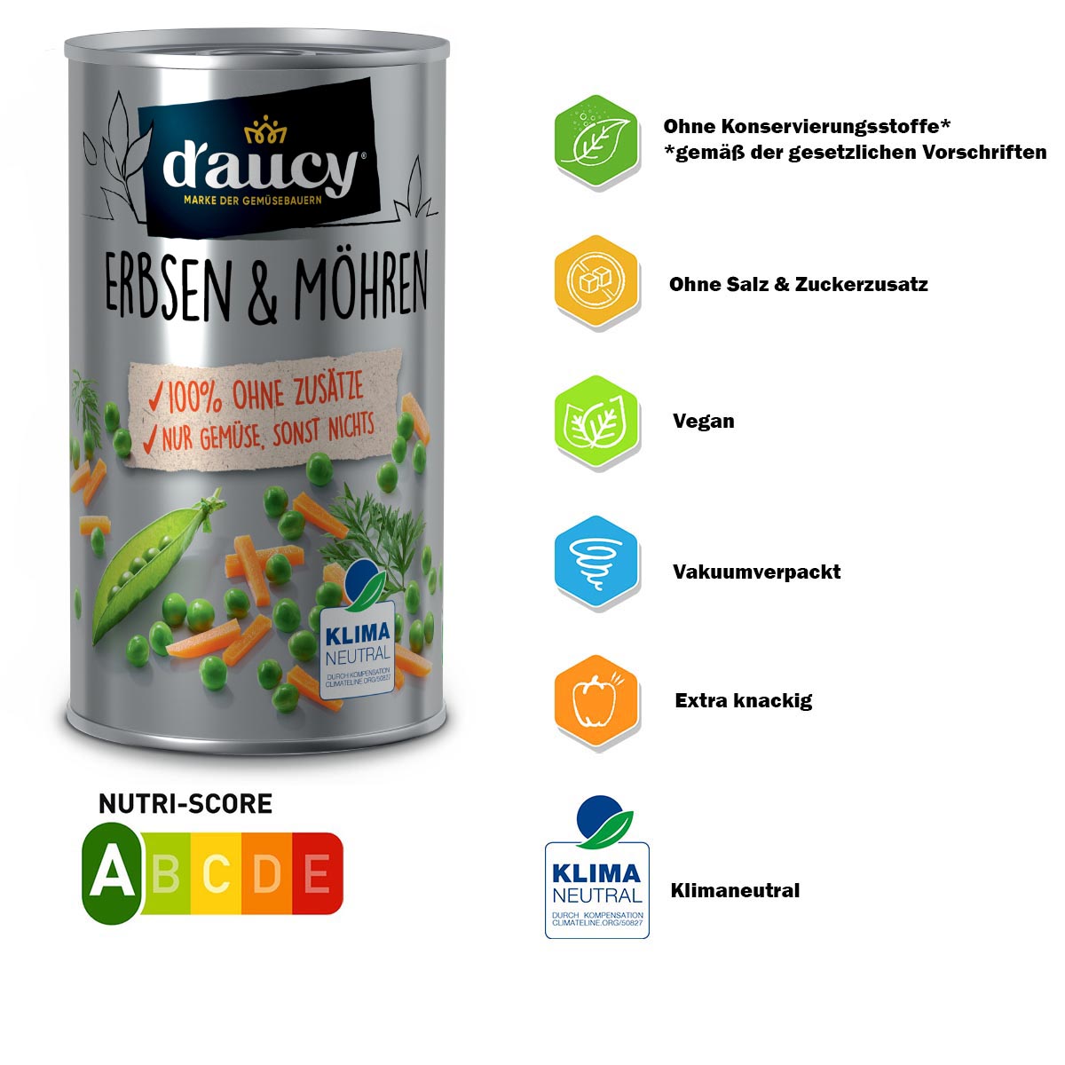 Als klimaneutrales Produkt trägt d'aucy aktiv zum Umweltschutz bei. Die Erbsen & Möhrchen werden unter nachhaltigen Bedingungen angebaut und verarbeitet, um eine positive ökologische Bilanz zu gewährleisten.