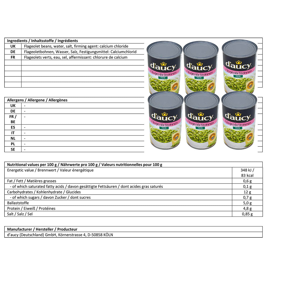 | Inhaltsangaben: | Flageoletbohnen, Wasser, Salz, Festigungsmittel: Calciumchlorid | ||||||||||||||