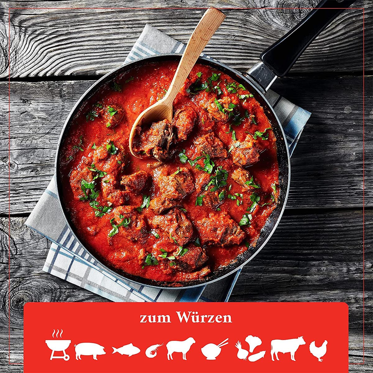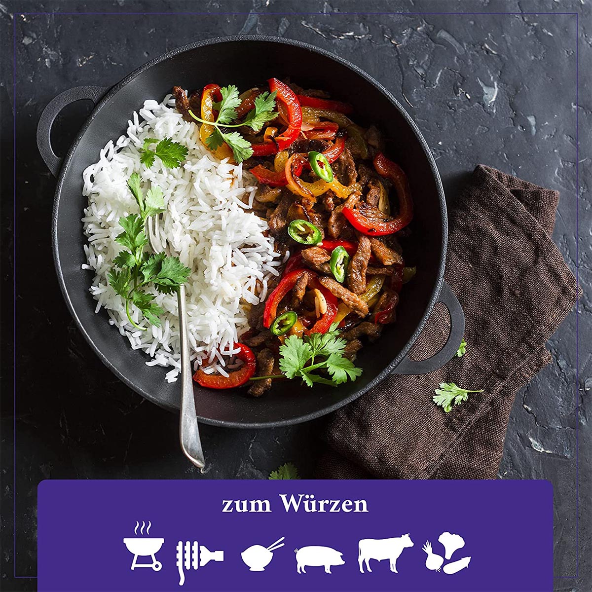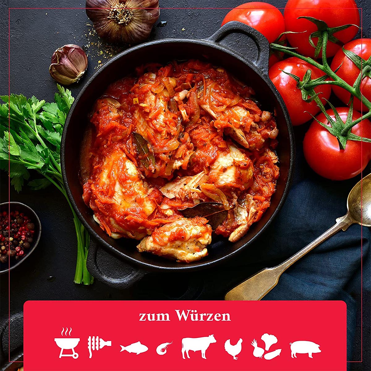 | Inhaltsangaben: | Paprika, Cayennepfeffer, Paprika gemahlen, Koriander, Galgant, Zitrone, Meersalz, Ingwer, Knoblauch, Zitronengras, Traubenzucker, Zwiebel | ||||||||||||||||
