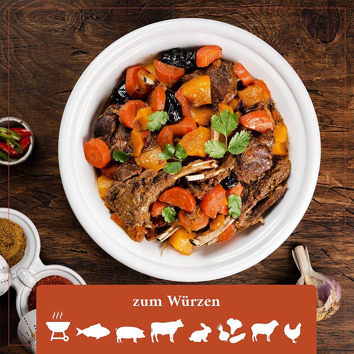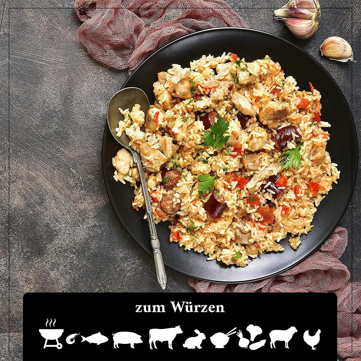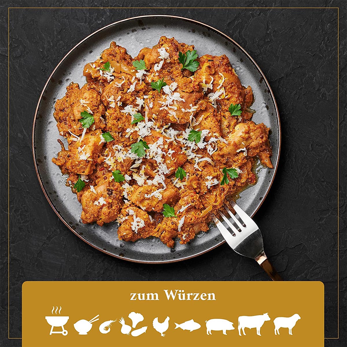 | Inhaltsangaben: | Paprika, Cayennepfeffer, Paprika gemahlen, Koriander, Galgant, Zitrone, Meersalz, Ingwer, Knoblauch, Zitronengras, Traubenzucker, Zwiebel | ||||||||||||||||