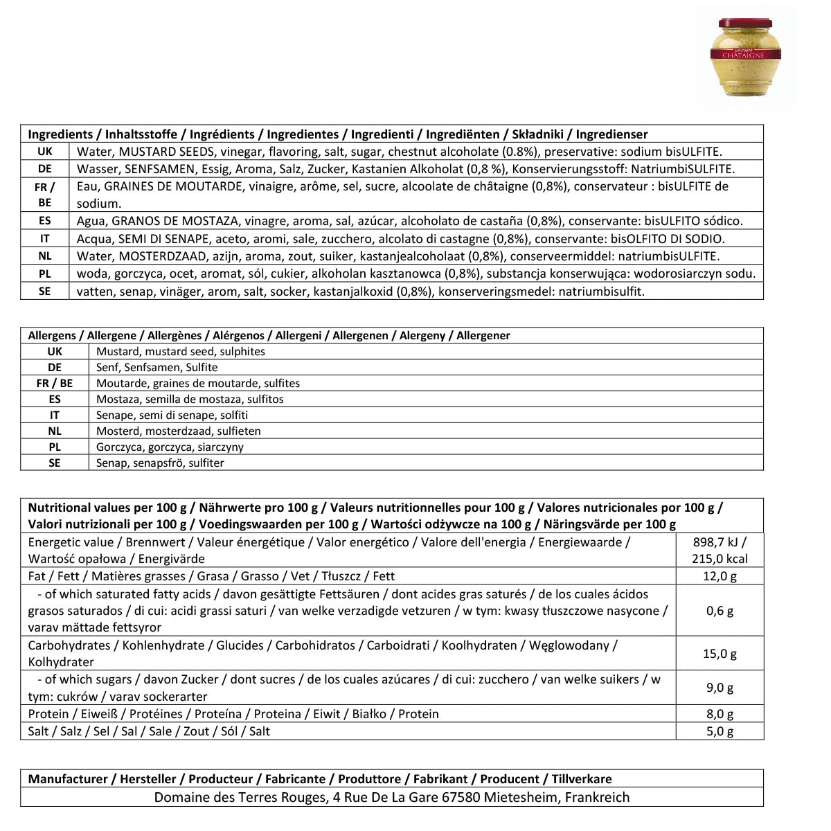 Vielseitige Verwendungsmöglichkeiten: Genießen Sie die Moutarde à la Châtaigne zu Käse, Fleischgerichten oder herbstlichen Salaten. Die harmonische Kombination aus Senf und Kastanien verleiht Ihren Gerichten eine besondere Raffinesse.