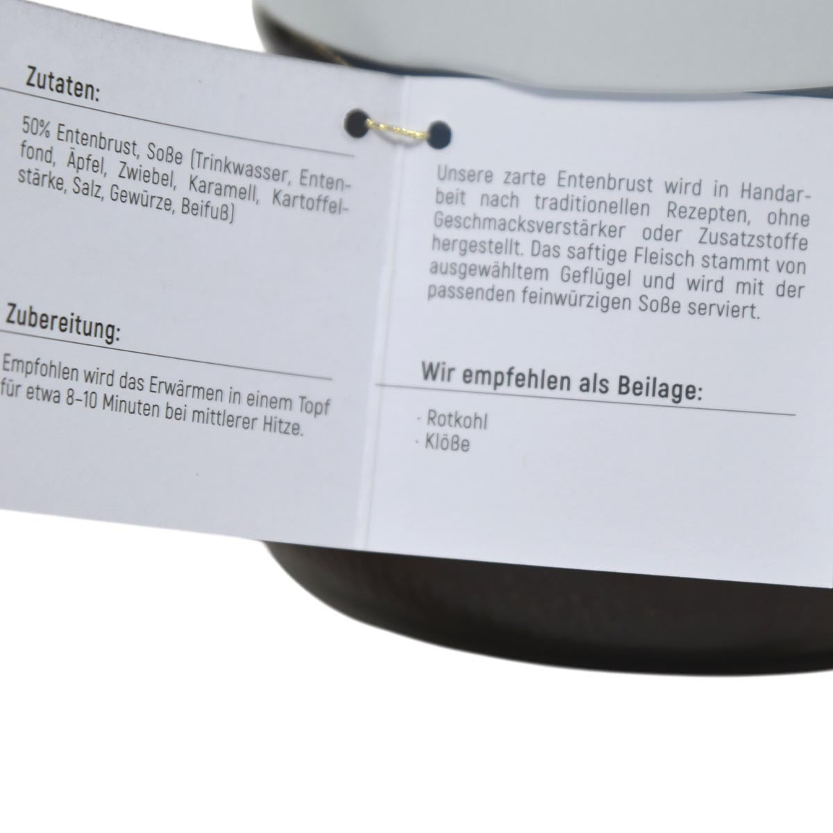 Die Dürrröhrsdorfer Entenbrust im Glas lässt sich schnell und unkompliziert zubereiten. Einfach das Glas öffnen, den Inhalt erwärmen und servieren. Für ein festliches Menü kombinieren Sie die Entenbrust mit klassischen Beilagen oder überraschen Ihre Gäste mit kreativen Rezeptideen.