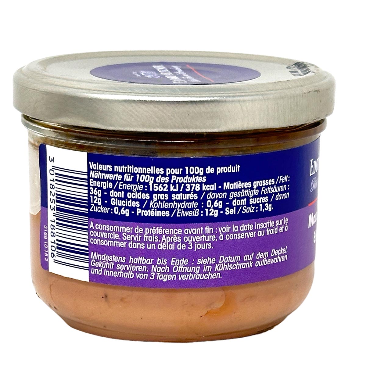Die Edouard Artzner Entenmousse Terrine mit Kirschwasser ist nicht nur ein kulinarischer Genuss, sondern auch ein optisches Highlight auf jeder Tafel. Die elegante Präsentation in der klassischen Terrinenform macht sie zu einem Blickfang auf jedem Buffet und unterstreicht die Exklusivität dieses Produkts.