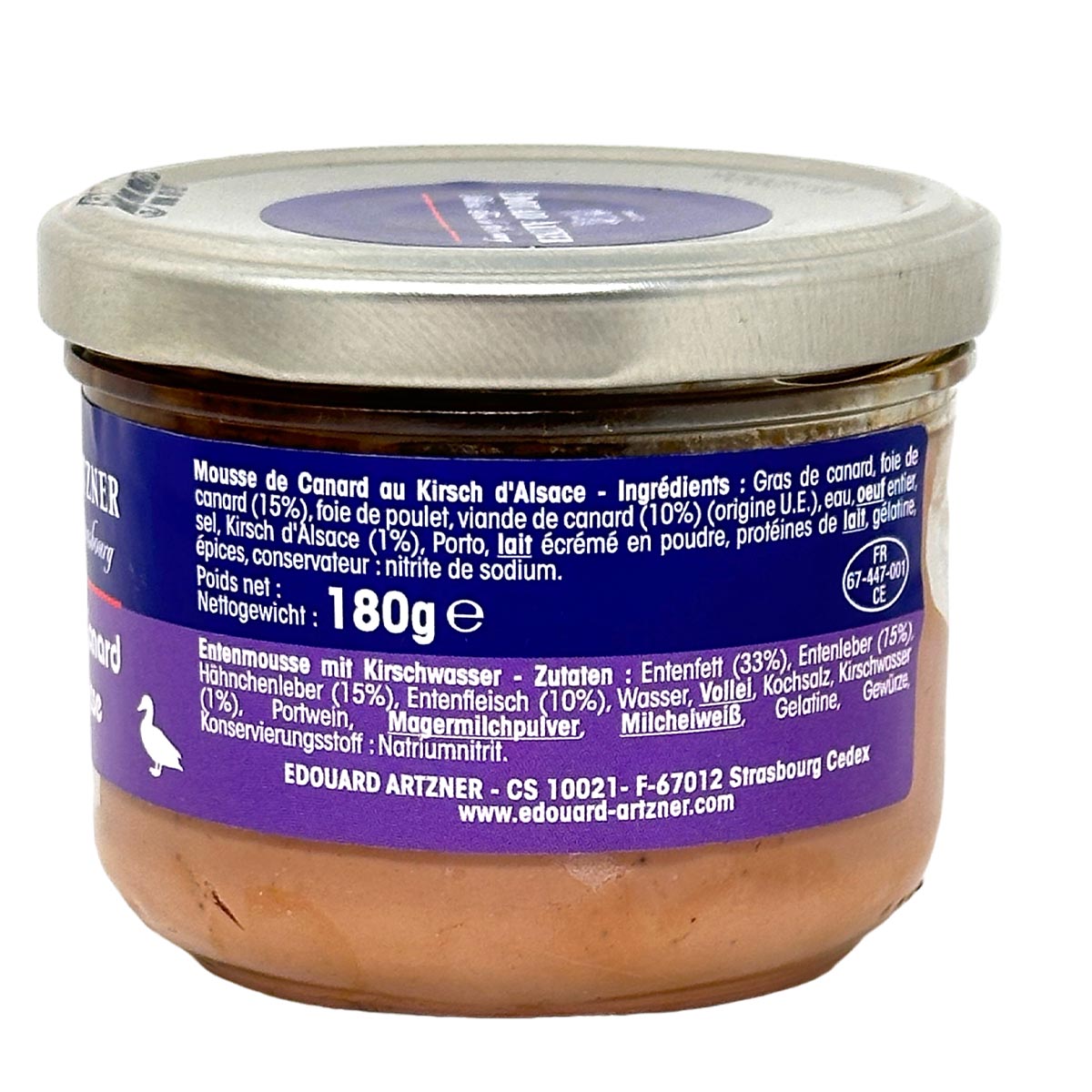 Edouard Artzner steht seit 1803 für exzellente Feinkostprodukte und die Entenmousse Terrine mit Kirschwasser ist ein herausragendes Beispiel dieser Tradition. Die Hauptzutat, feinste Ente, wird sorgfältig ausgewählt und schonend verarbeitet, um das volle Aroma zu bewahren. Das Kirschwasser, ein hochwertiger Schnaps aus dem Elsass, verleiht der Terrine eine besondere Note und rundet den Geschmack perfekt ab.