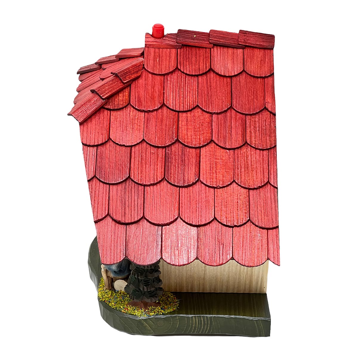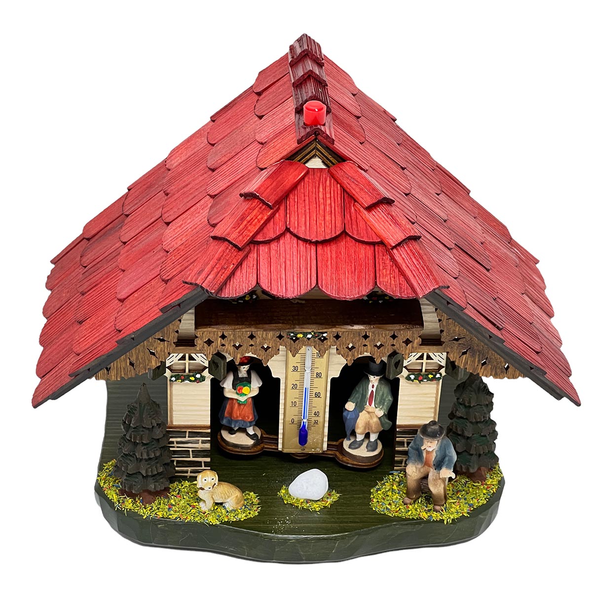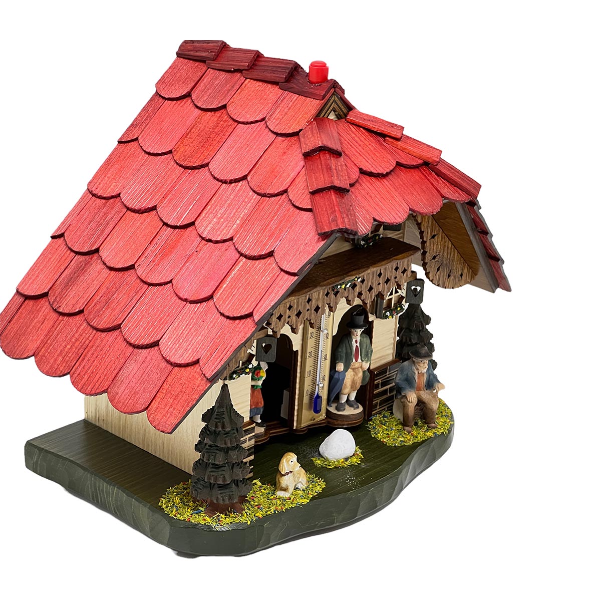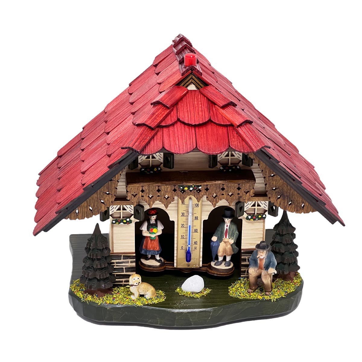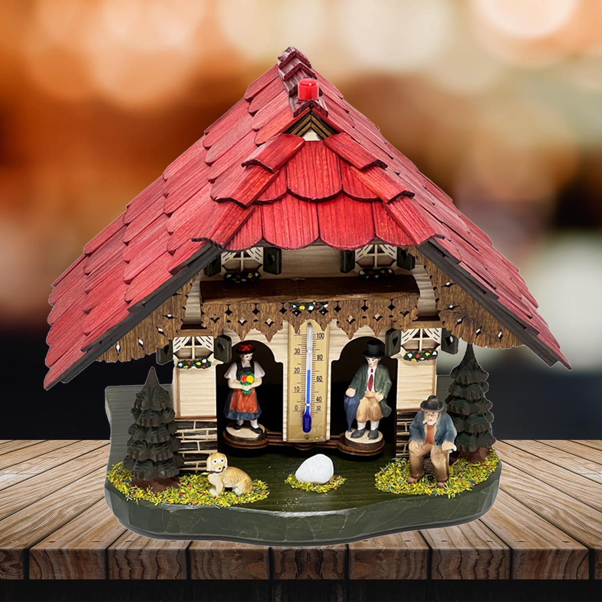 Die Wetterstation verfügt über ein integriertes Thermometer und ist mit handgeschnitzten Figuren verziert, die ihr einen einzigartigen Charakter verleihen.
