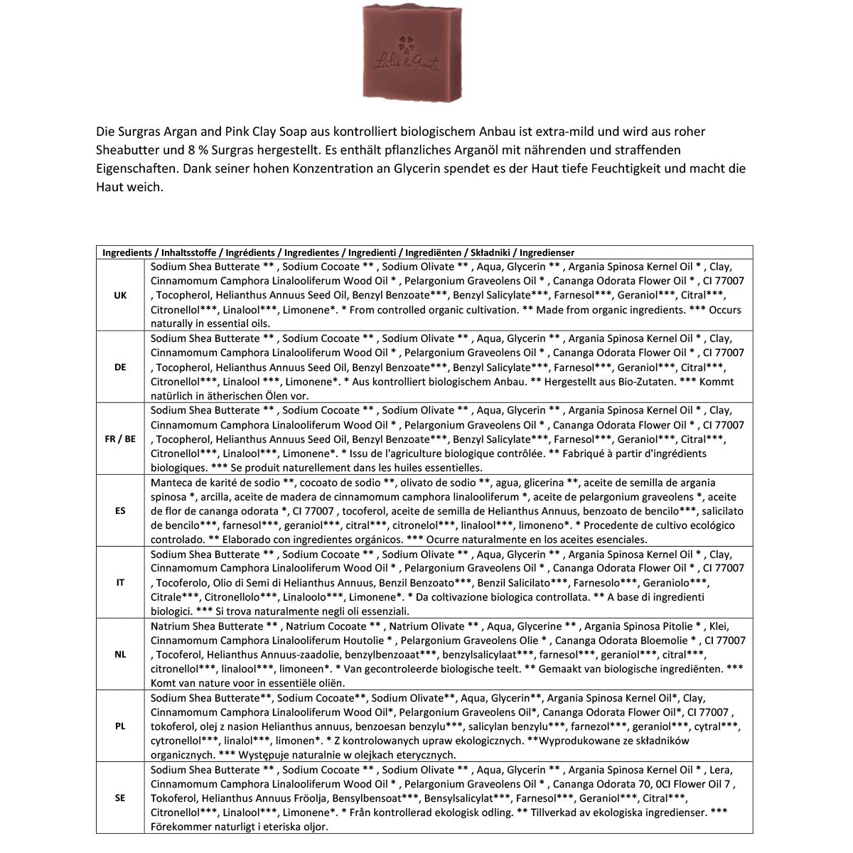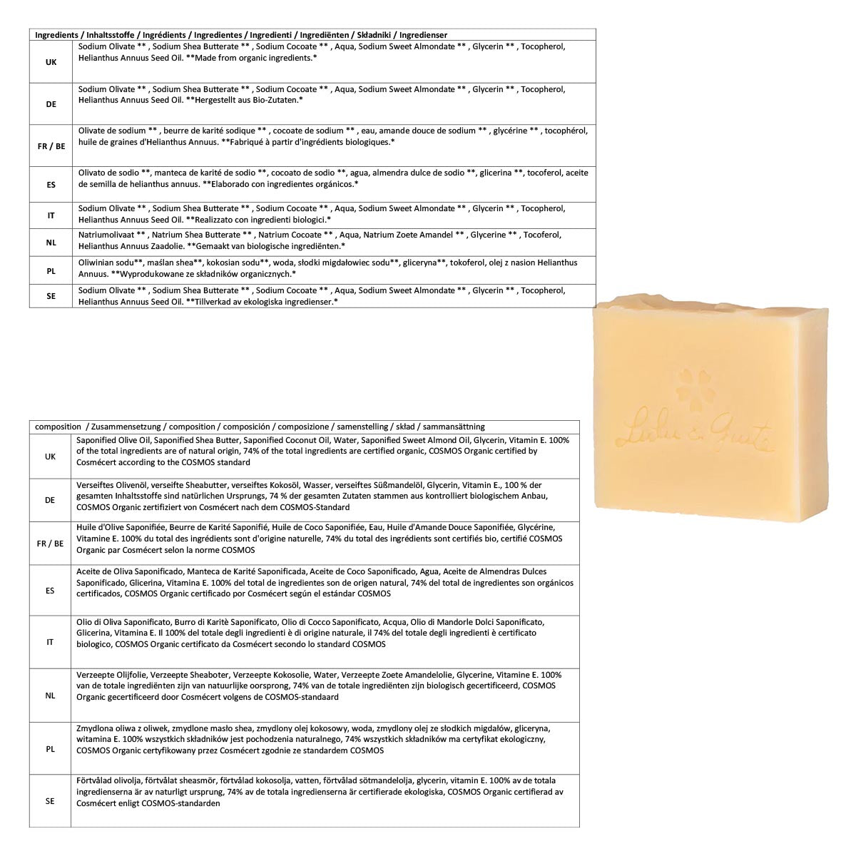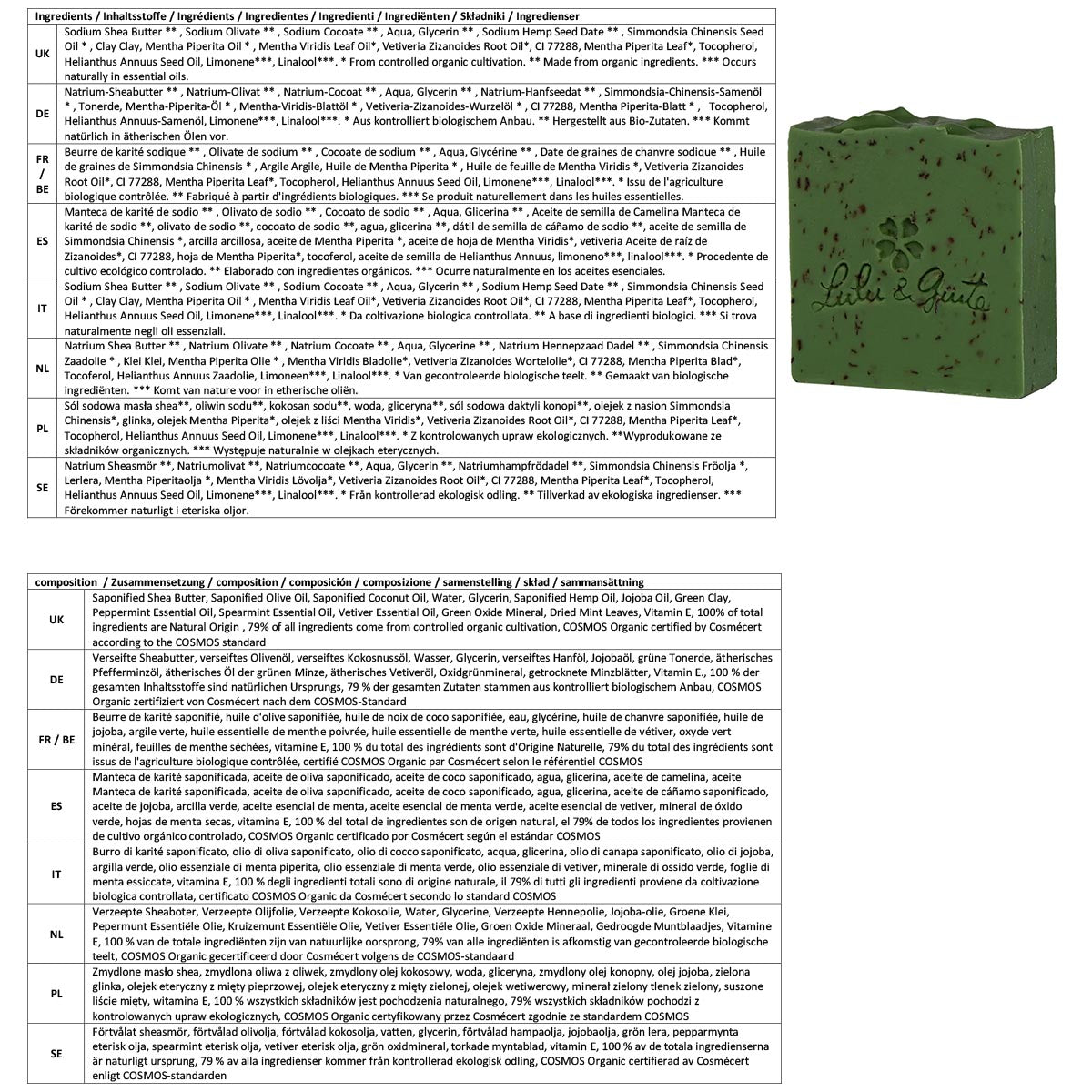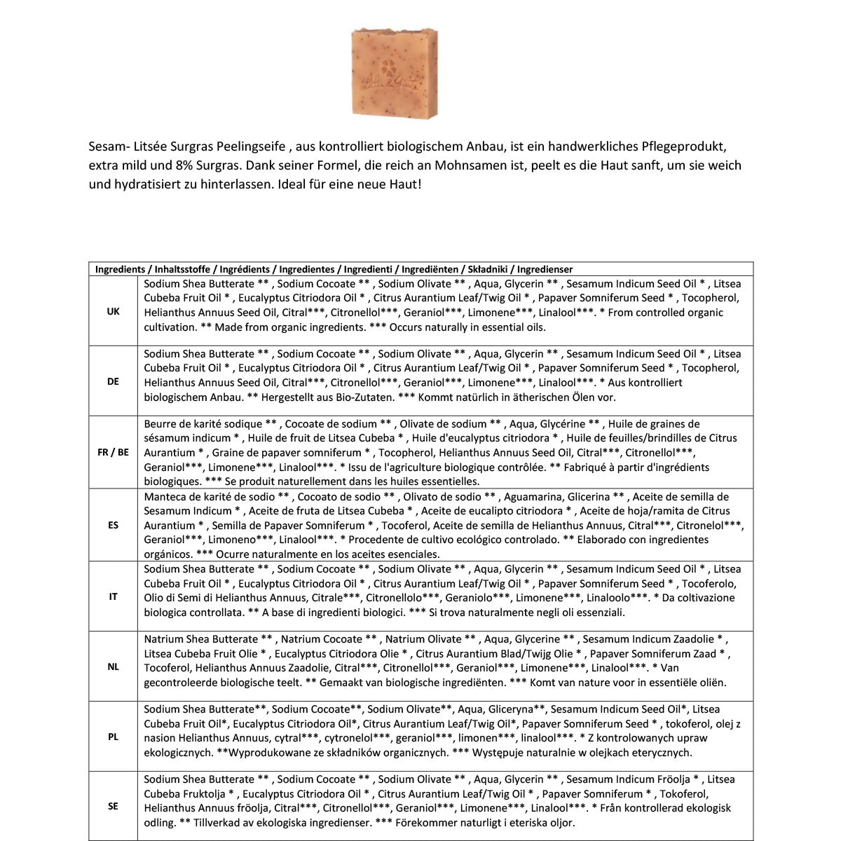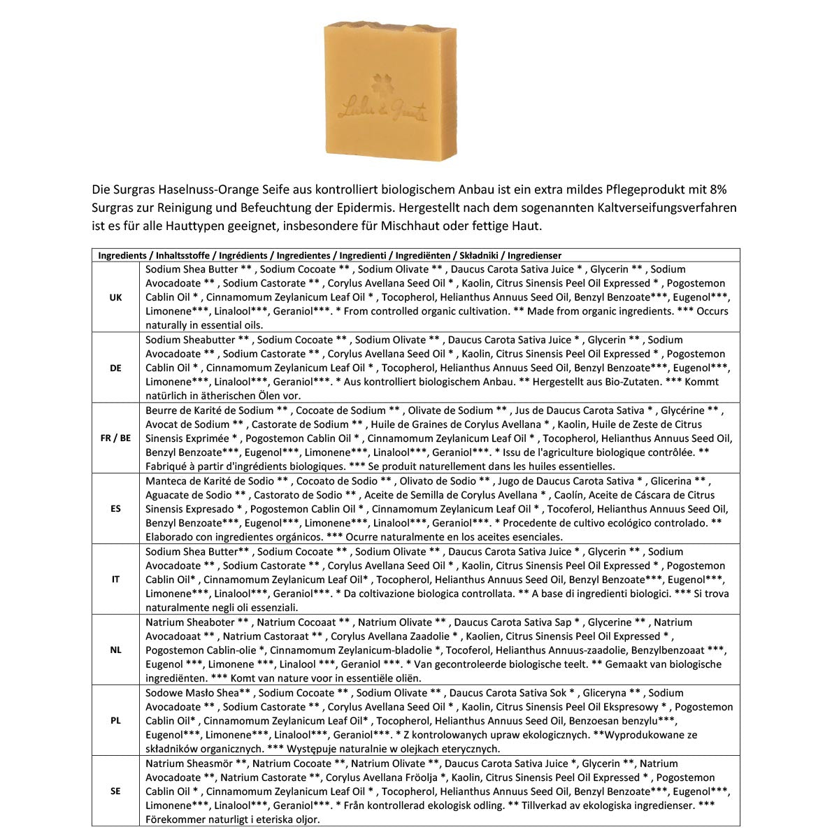 - Die Seifen sind zu mindestens 6 % überfettet, d. h. es wird mehr Öl zugesetzt als für die Verseifung erforderlich ist, dieses Öl schützt und nährt die Haut.