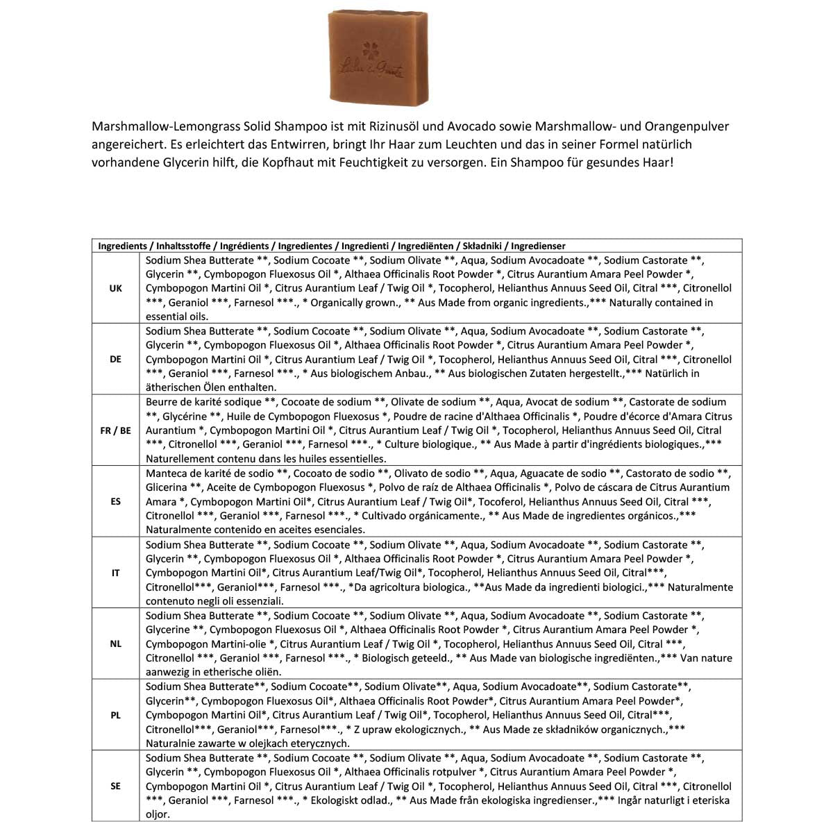 - Mit einem einzigen Produkt können Sie Körper und Gesicht waschen, mit Feuchtigkeit versorgen und pflegen, Ihre Haare waschen (Spülen mit Essig oder Zitronenwasser) und Ihr Baby/Kind waschen (mit Seifen ohne ätherische Öle).