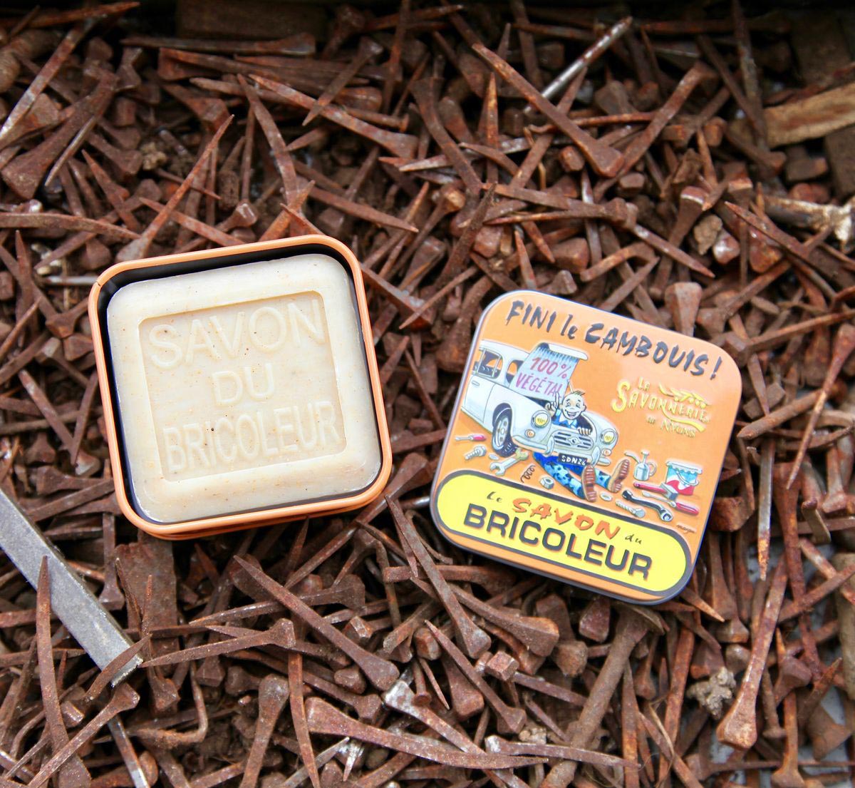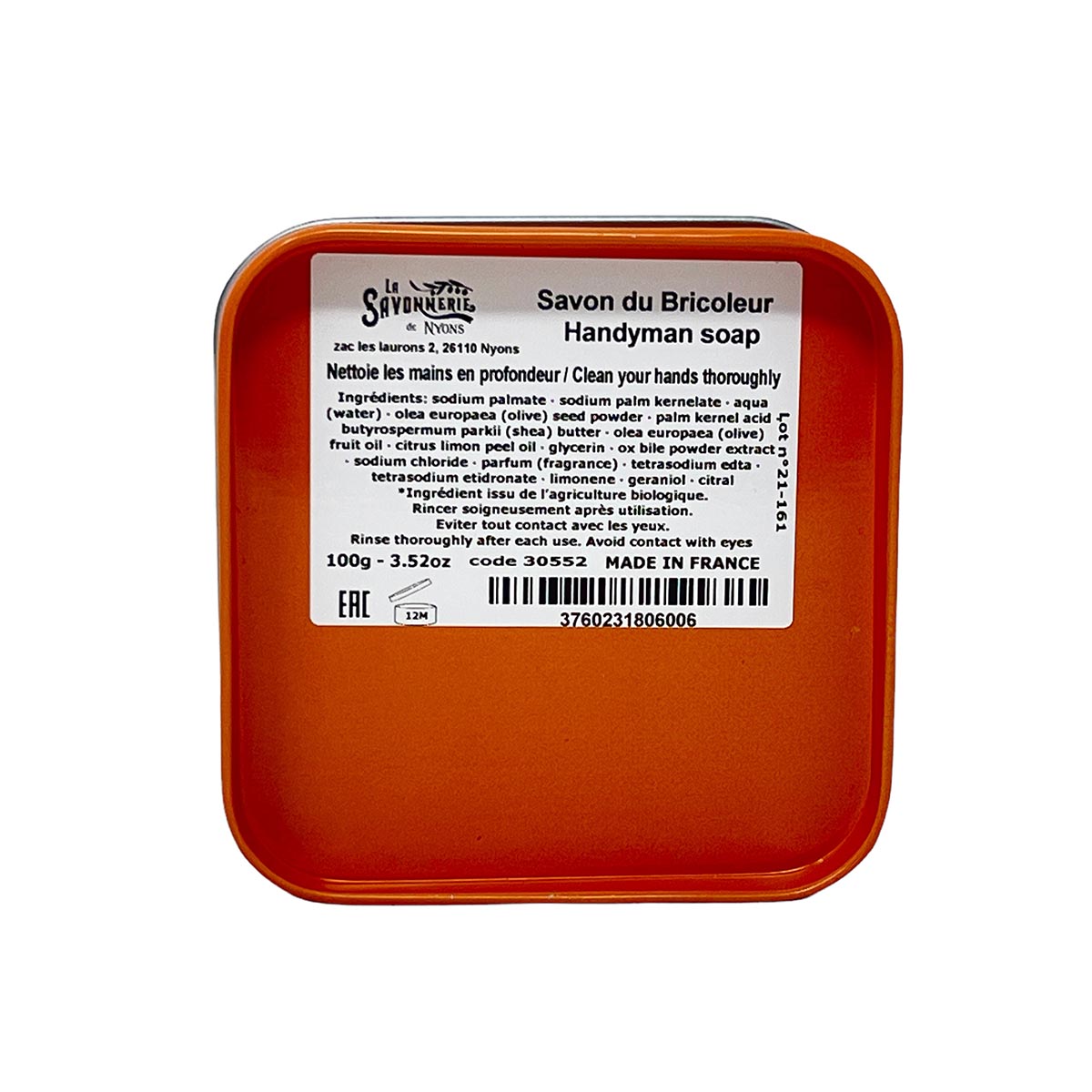 Erleben Sie die Kombination aus robuster Reinigung und natürlicher Pflege mit der La Savonnerie De Nyons Handwerker Seife in der praktischen Metalldose. Ideal für alle, die Wert auf saubere Hände nach handwerklichen Projekten legen.