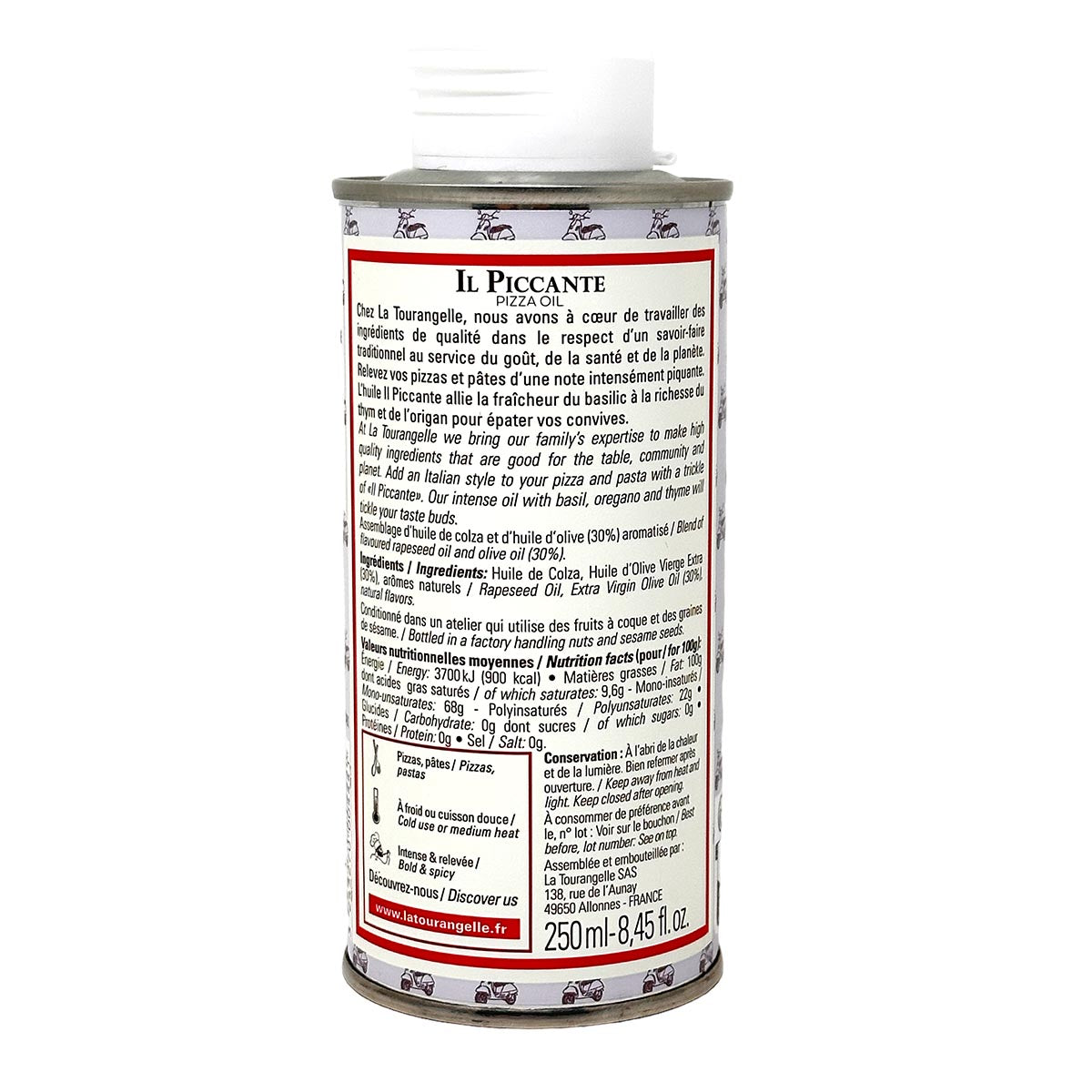 Dieses intensive und geschmackvolle Pizzaöl von LA TOURANGELLE wird in einer Ölmühle in Frankreich handgefertigt. Genießen Sie den köstlichen Geschmack von Basilikum und Oregano, dass in fruchtigem Extra Nativem Olivenöl eingegossen ist, mit einer Prise scharfem Chiligewürz. Ein wahrer Genuss! Verfeinert Sie mit diesem Pizzaöl 'Il Piccante' Ihre Pizza und Pastagerichte.
