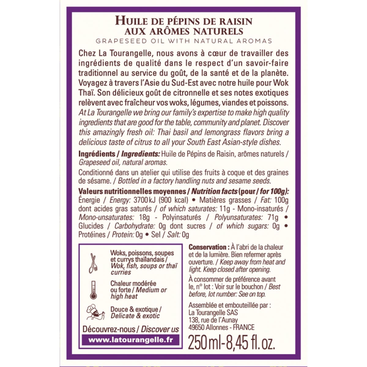 Mit dem Thai-Wok-Öl von LA TOURANGELLE kann schnell und einfach ein köstliches thailändisches Gericht wie Thai-Currys und Suppen gezaubert werden. Das Thai-Wok-Öl besteht aus Traubenkernöl ist speziell auf die Anforderung an das Braten im Wok abgestimmt. Durch den hohen Rauchpunkt von über 180˚C eignet es sich ideal zum Kochen, aber auch zum Braten. Das Aroma des Thai-Basilikums mit dem milden Minz- und Lakritzgeschmack, sowie der Zitronen-Note, lässt auch gebratenes Fleisch, Gemüse und Salate zu einem kulinarisches Erlebnis werden.