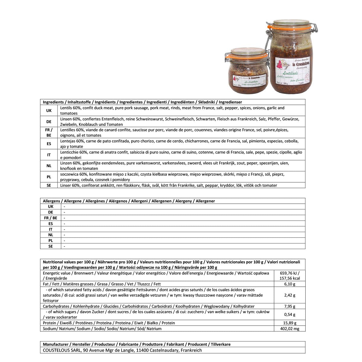 Le Coustelous Lentillade Linsen mit Entenkeule und Wurst im Glas – Versch. Größen