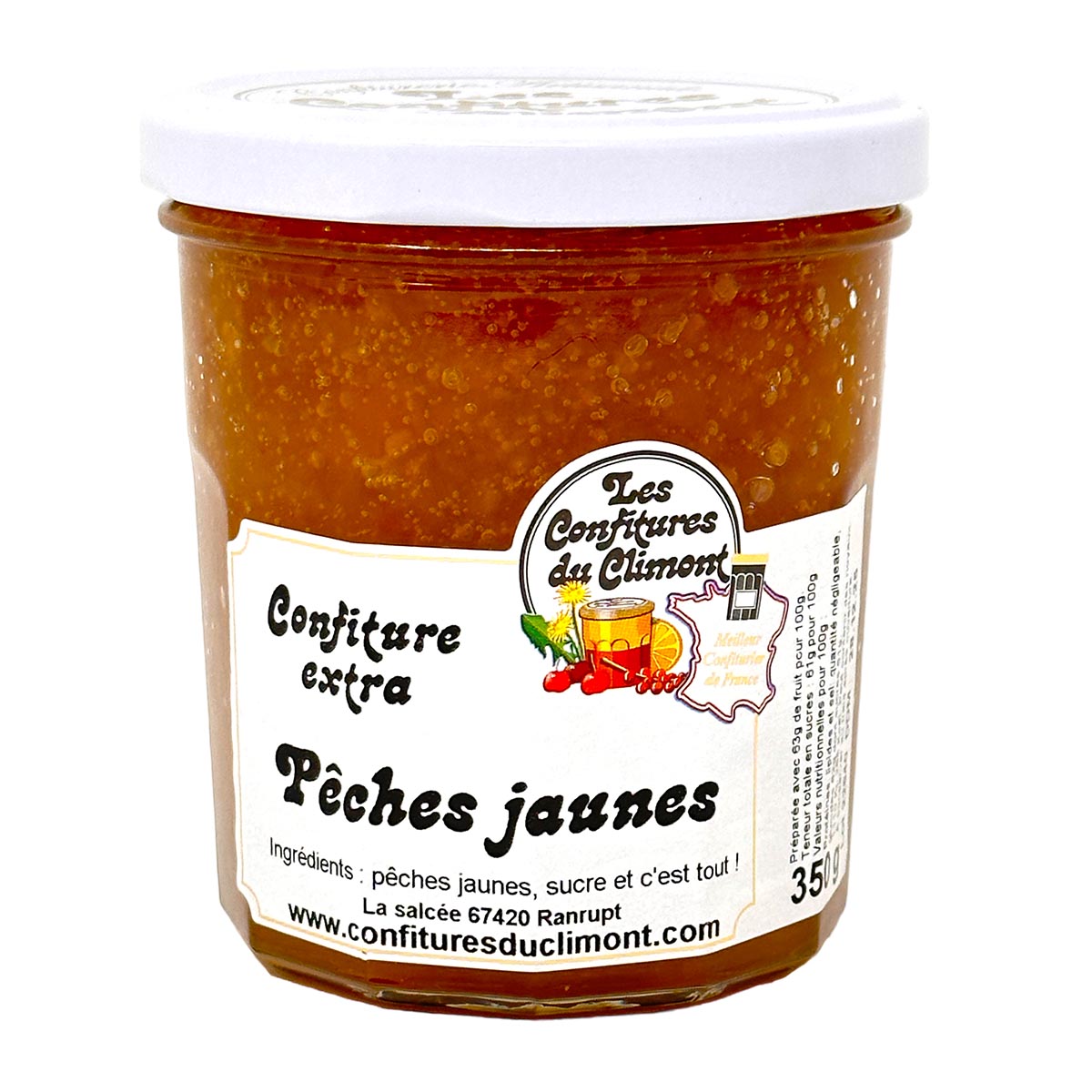 Entdecken Sie die Les Confitures du Climont Gelber Pfirsich Konfitüre Extra, eine handwerklich hergestellte Spezialität aus dem Elsass. Diese einzigartige Konfitüre verwöhnt Sie mit dem intensiven Geschmack sonnengereifter, gelber Pfirsiche.