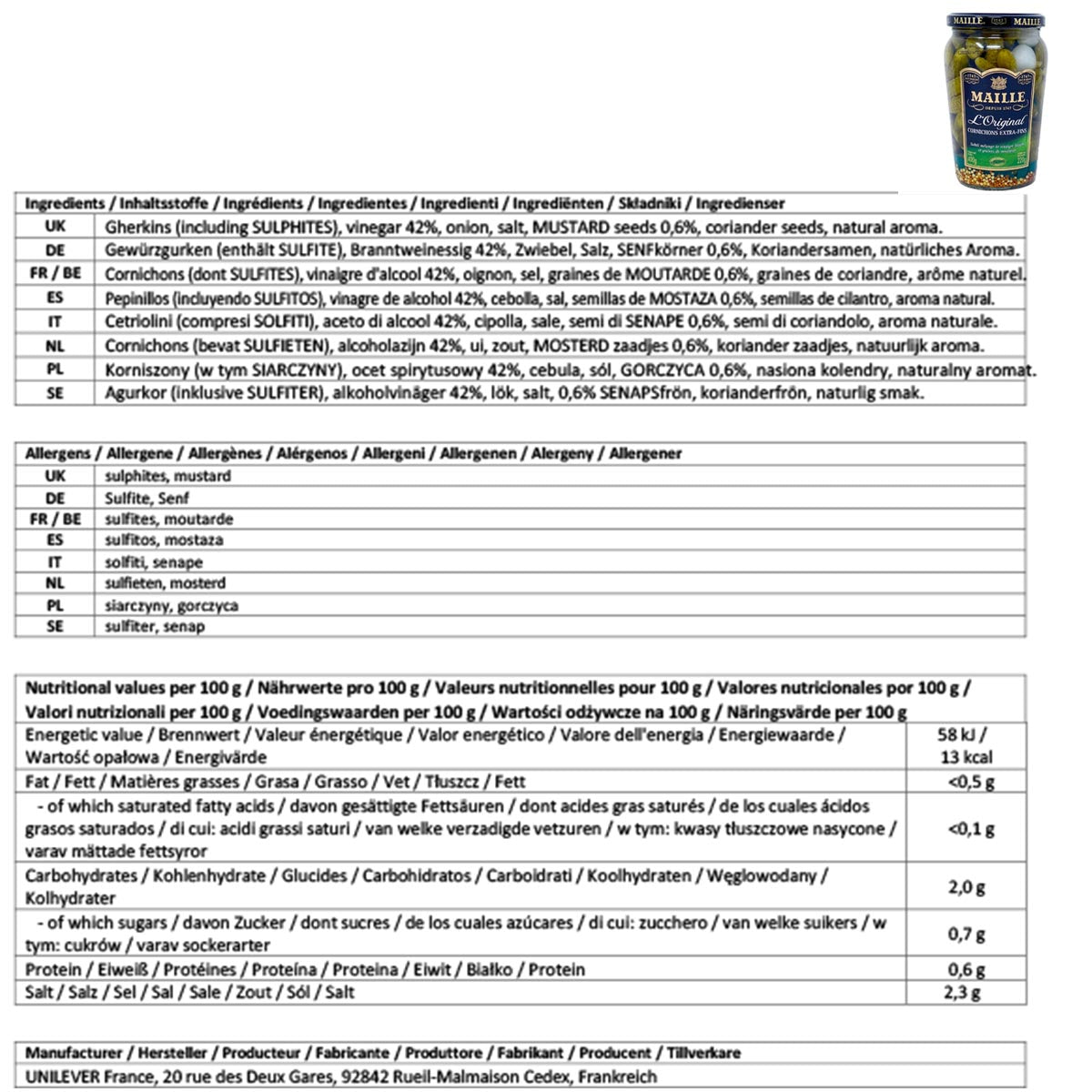Fazit: Mit den Maille Mini Gurken Cornichons Extra fein holen Sie sich ein Stück französische Esskultur direkt nach Hause. Ob als Beilage zu festlichen Gerichten, als Snack für zwischendurch oder als Teil eines luxuriösen Buffets – diese Cornichons verleihen Ihren Mahlzeiten das gewisse Extra. Genießen Sie die perfekte Balance aus Säure und Süße, die knackige Textur und den unvergleichlichen Geschmack, der nur aus der traditionellen Herstellung von Maille stammen kann. Gönnen Sie sich und Ihren Lieben diesen besonderen Genuss und bringen Sie französischen Flair in Ihre Küche!