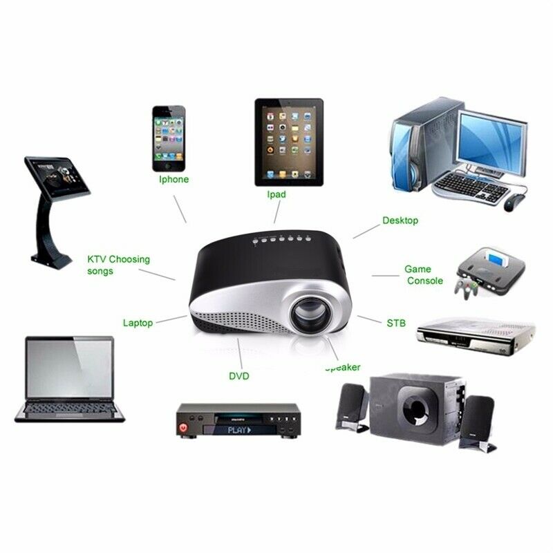 Unser Mini LED Projektor unterstützt eine Vielzahl von Anschlussmöglichkeiten, darunter AV und HDMI. So können Sie problemlos Ihre Lieblingsgeräte wie DVD-Player, Laptops, Spielkonsolen und mehr anschließen und Ihre Inhalte in großem Stil genießen.