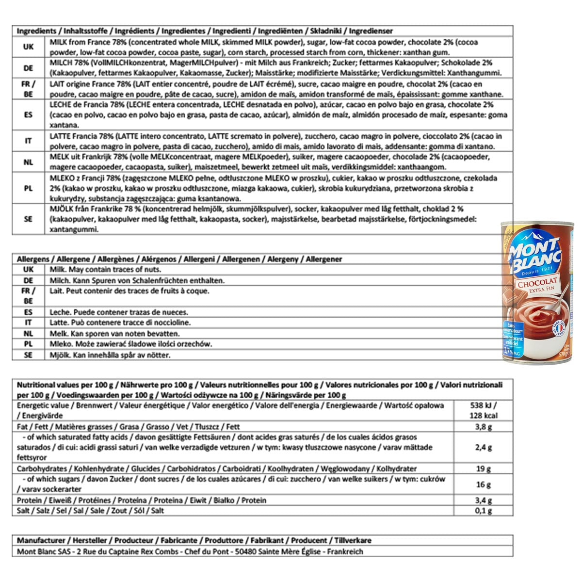 - Vielseitige Anwendung: Mont Blanc La Crème Dessert au Chocolat ist nicht nur als Dessert in reiner Form ein Genuss, sondern auch ideal als Zutat für andere Desserts. Verwenden Sie es als Füllung für Gebäck, Topping für Eiscreme, oder mischen Sie es in Ihre Muffins und Kuchen für eine schokoladige Überraschung.