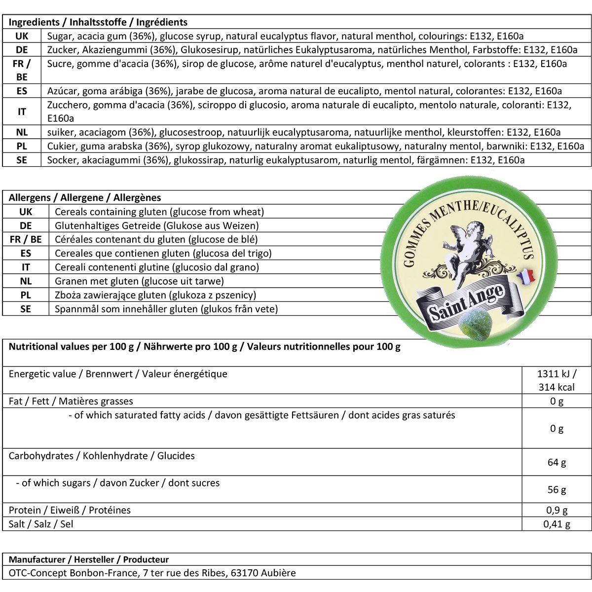 Die Saint-Ange Minze/Eukalyptus-Pastillen bestehen ausschließlich aus natürlichen Zutaten und enthalten keine künstlichen Aromen, Farbstoffe oder Konservierungsstoffe. Sie können sicher sein, dass Sie ein gesundes Produkt genießen, das ausschließlich aus den besten natürlichen Rohstoffen hergestellt wird.