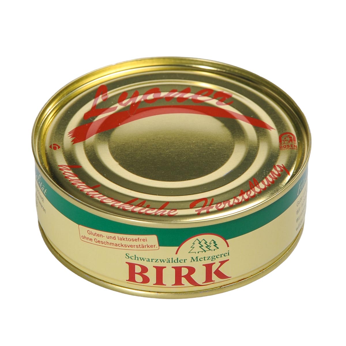 Entdecken Sie die handwerklich hergestellte Dosenwurst Lyoner der Schwarzwälder Metzgerei Birk. Diese delikate Wurstspezialität wird nach traditionellen Rezepten und mit sorgfältig ausgewählten Zutaten hergestellt, direkt aus eigener Herstellung.