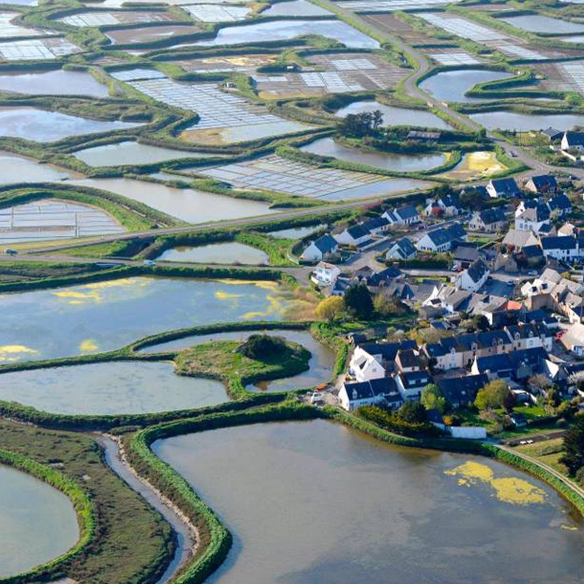 die Salzwiesen von Guérande, die von den Traicts du Croisic gespeist werden und sich auf dem Gebiet der Städte Batz-sur-Mer, Guérande, La Turballe, Le Croisic und Le Pouliguen befinden.